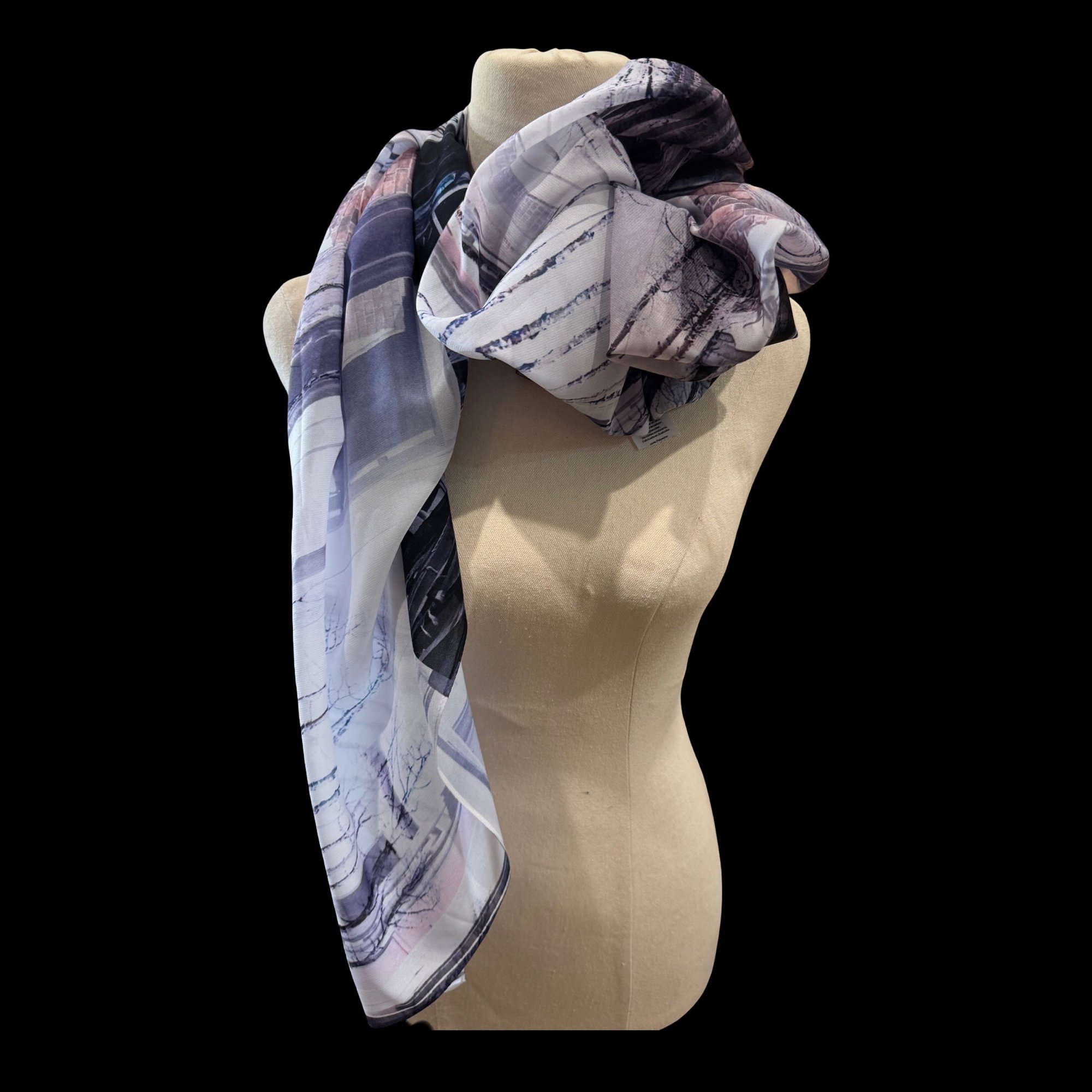 Limited edition print of an original artwork by Maria Leoni. 140cm square polyester scarf with an original photographic collage print.