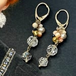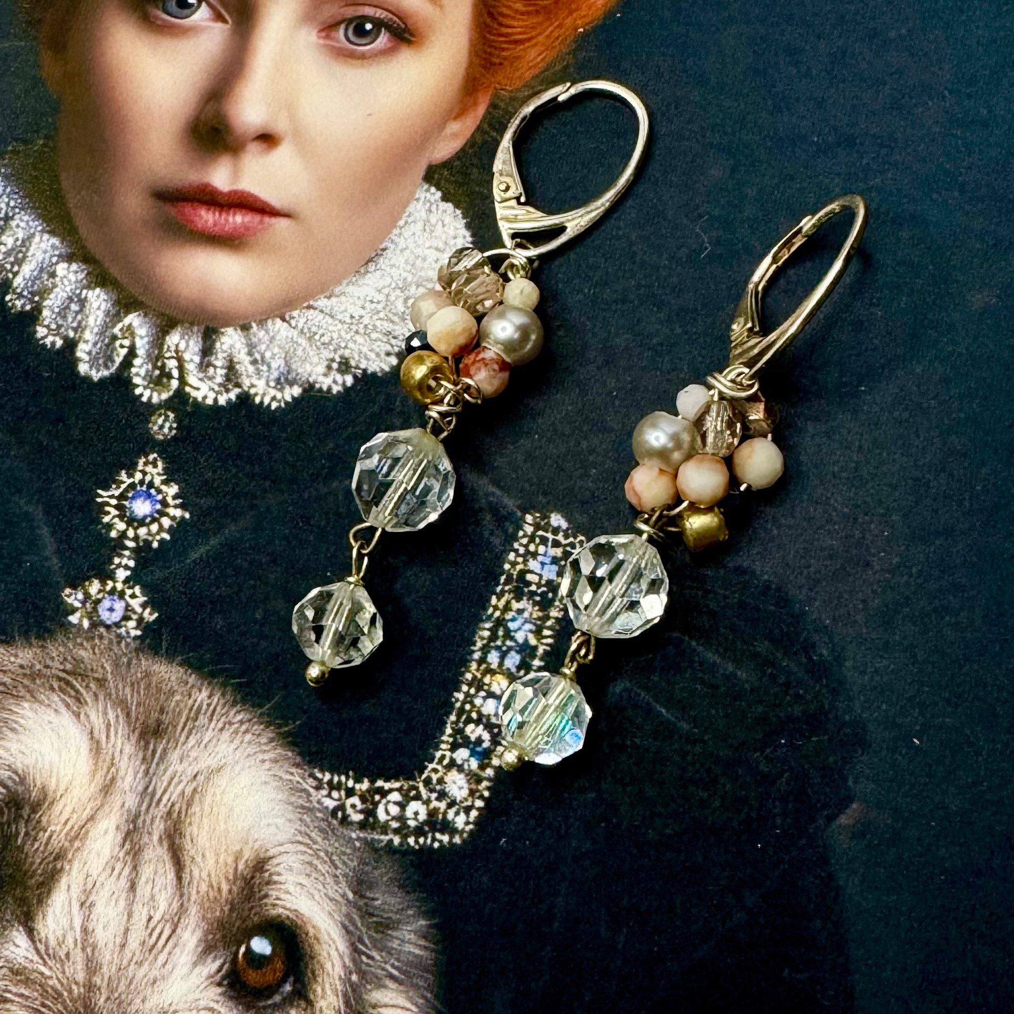 Composed of vintage crystals, Peruvian opal, freshwater pearls and Swarovski crystals, these earrings are light, delicate and yet have great impact! Combined vintage pieces with sterling silver and semi precious stones a contemporary and vintage elements come together for a one of a kind, unique pair of earrings, made to treasure for ever.